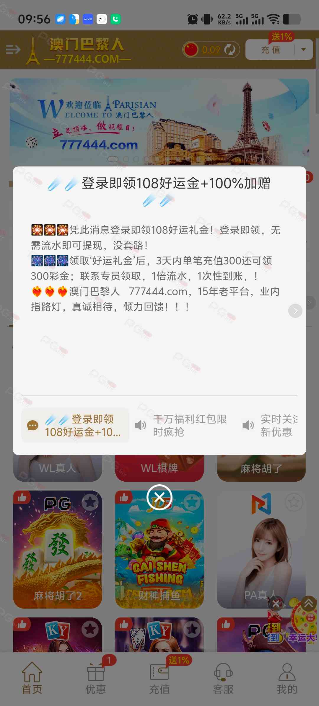 -----------------------------------------------登录账号就会弹出彩金的,估计是有充值了才有,108块彩金,然后还有一个充值的活动我问客服说300元送300元 1倍流水,上个月输的有点多可能是点击进入巴黎人777444