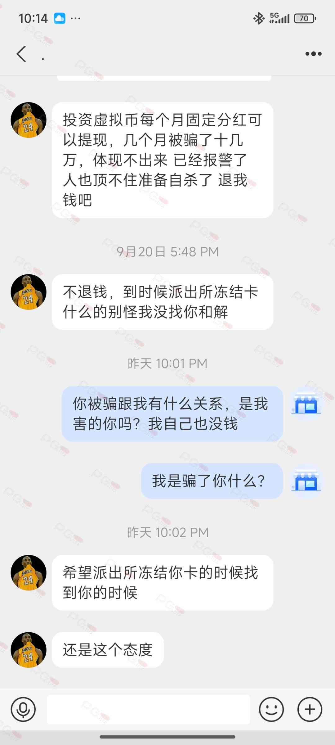 一月份的时候,在一个直播台卖波币卖了600,然后前天突然举报我,然后和我发信息,我的提现收款都被封了,那个人前天早上把我举报了,然后和我发消息说,他让我退钱,他和我说他在微信的小程序小天使几个月,说虚拟币固定分红,然后几个月被骗几手万,一月的事,前天和我发消息让我退钱,并且说已经和派出所的说了,他说他哥要一个个来抓,不退钱就去和派出所解释去,然后实际上我的情况是什么就是直播台正常卖波币,不知道是不是诈骗的人买了我的波币并发给他,还是什么情况,我真心很迷茫,我到底该不该退他我自己也是一个挂逼仔,主要是我还是无辜的,我是无辜的,这是属于收到黑钱还是什么情况,有没有懂得老哥。图片我放在帖子下面以免发不出来
