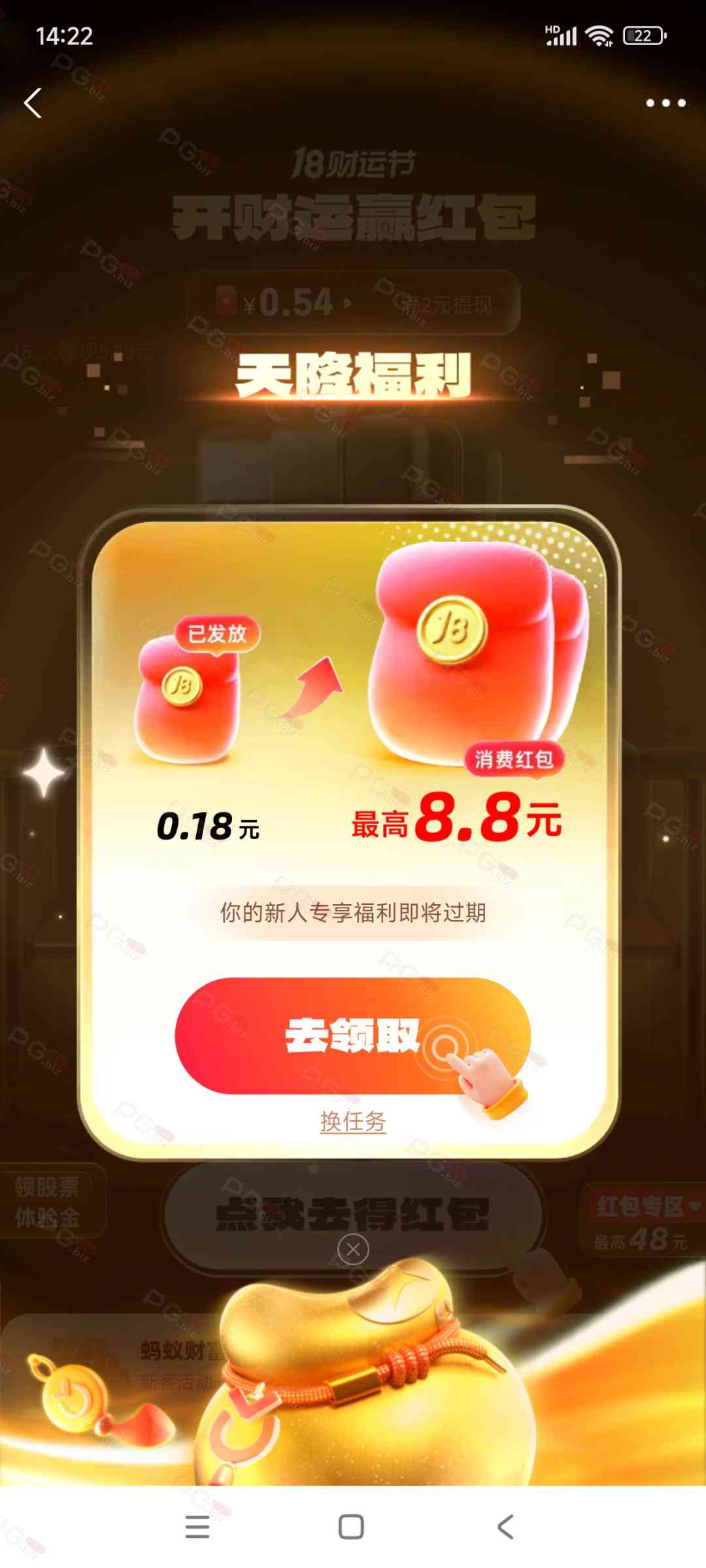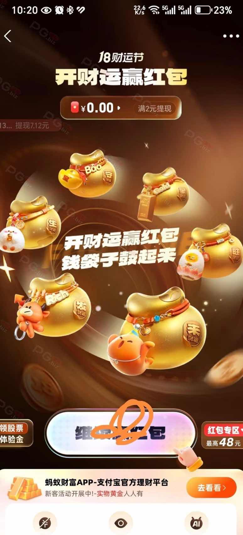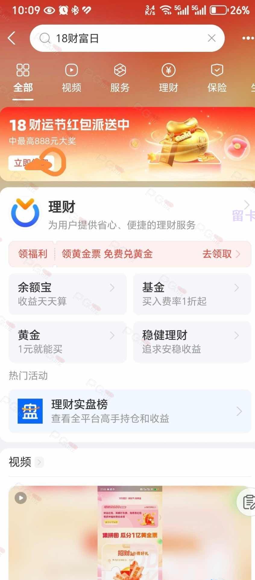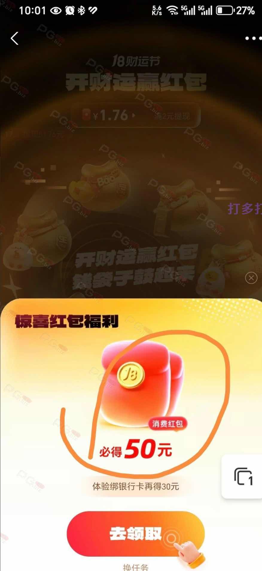 支付宝搜索18财富日,点击去领取,到里面抽奖,一直抽到有50消费红包的任务,然后去领取,做任务有的还会有30绑卡红包