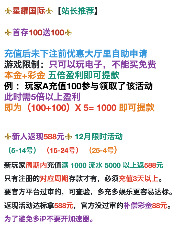 ✅ 三倍流水可提现,最低提现100金币✅ 不能(买/藏免费) 只能娱乐PG电子✅ 封顶提1500金币,多余金币扣除✅ 禁止多账号,多IP搞小号(无法提款)✅ 论坛金币为5比1的比例提现✅ 抽奖盈利取款时会查本帖回复的 星耀国际账号 ✅ 如遇乱留账号,不是 星耀国际账号 都不能提现 ✅ 请确保您已通过论坛链接注册了 星耀国际账号 ✅ 不是通过论坛链接注册的用户将无法派送奖金