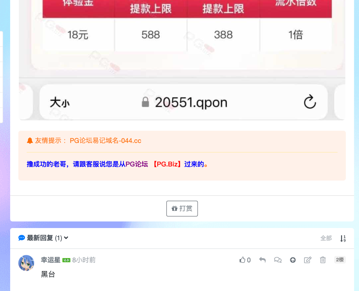 撸成功的老哥,请跟客服说您是从PG论坛 【PG.Biz】过来的。